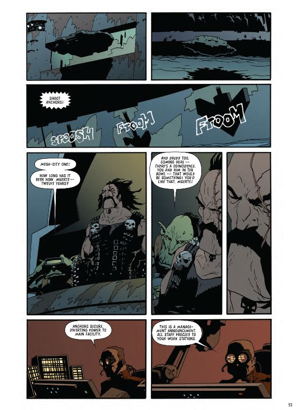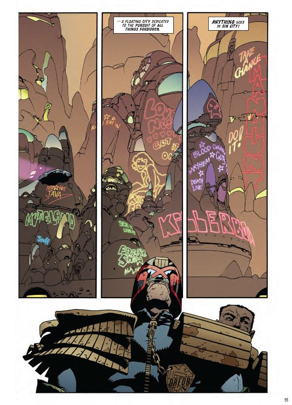 The floating multi-story metropolis of illegal delights known as 'Sin City' has anchored outside Mega-City One, and Dredd has seemingly been sent aboard to keep what order can be kept on this lawless pleasure city.